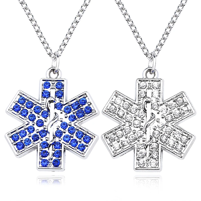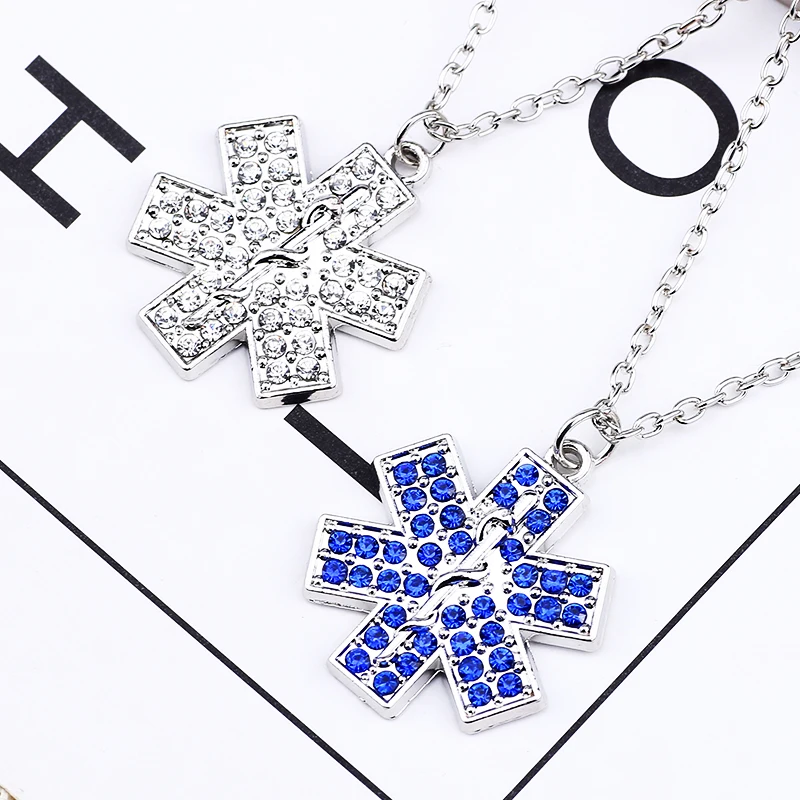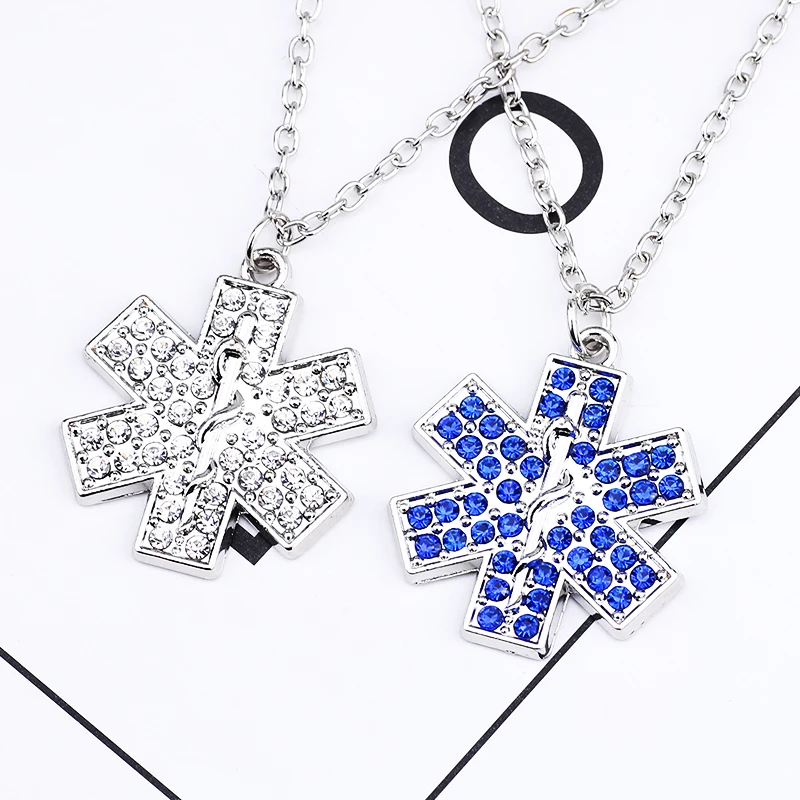Pre-owned Rhinestone Blue White Medical Logo Symbol Necklaces Popular Silver Chain Jewelry Fashion Geometric